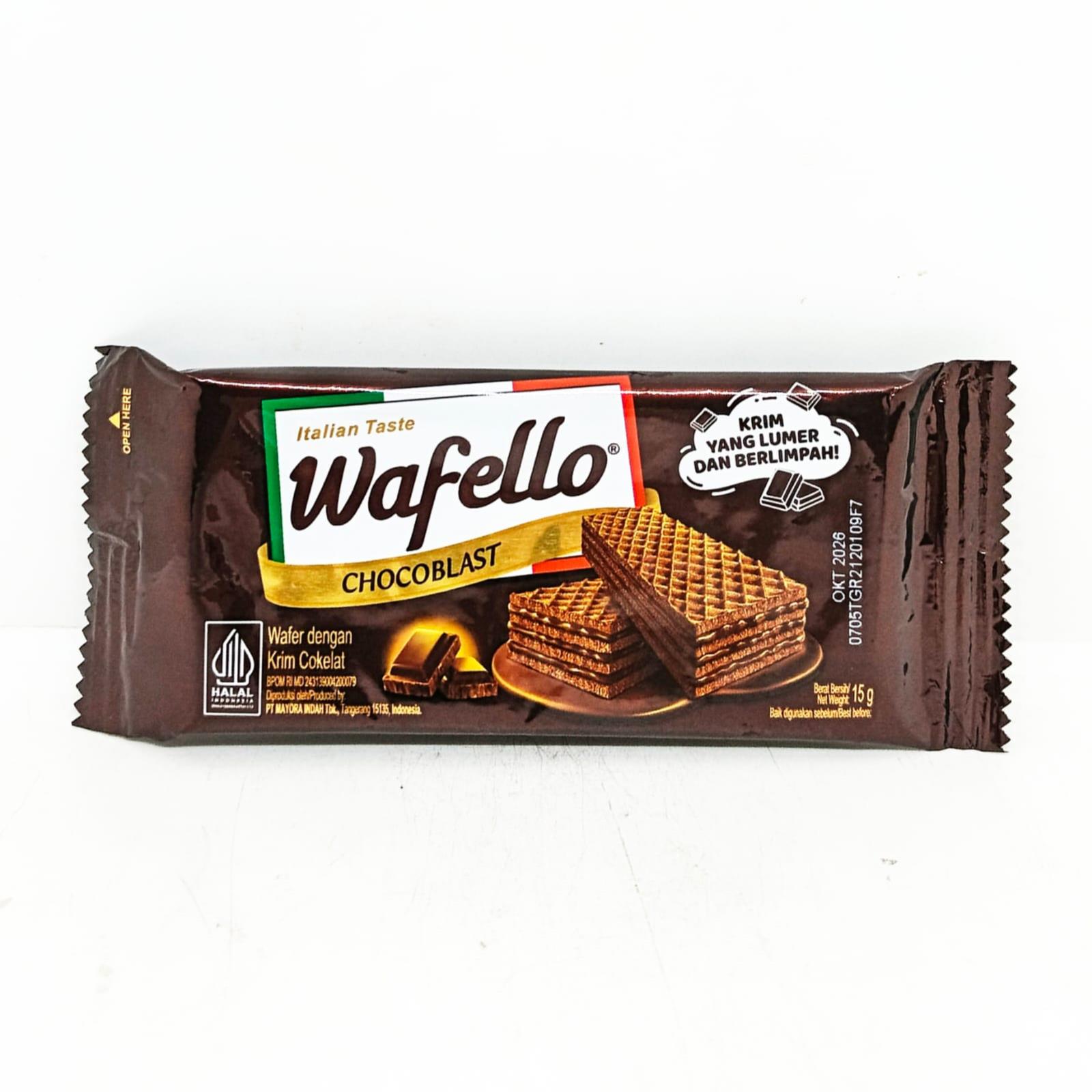 ROMA WAFELLO CHOCO BLAST 16 GR Wafer krim karamel yang karamelnya terlalu enak untuk dilupakan, dan bikin ketagihan dengan rasa dari waffelo ini.. buruan cobain sekarang juga sebelum kehabisan